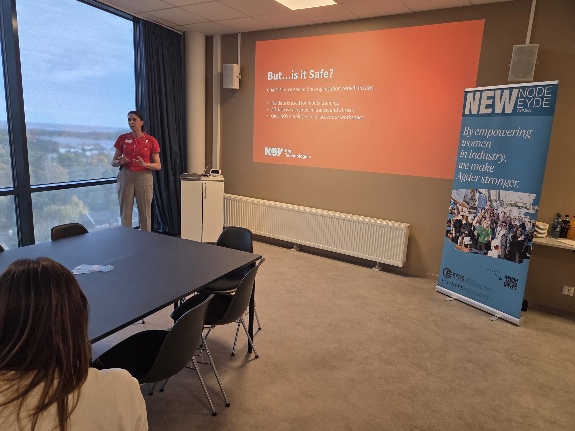 Hanne Swatland Gunnarsson fra NOV fortalte om utrullingen av ChatGPT Enterprise i sin organisasjon, og hvordan KI kan bli en nyttig kollega i hverdagen. Hun delte erfaringer med opplæring i mindre grupper, viktigheten av gode og tydelige prompts, og hvordan man kan bruke KI til å hente tekst, standardisere prosedyrer og effektivisere arbeid.